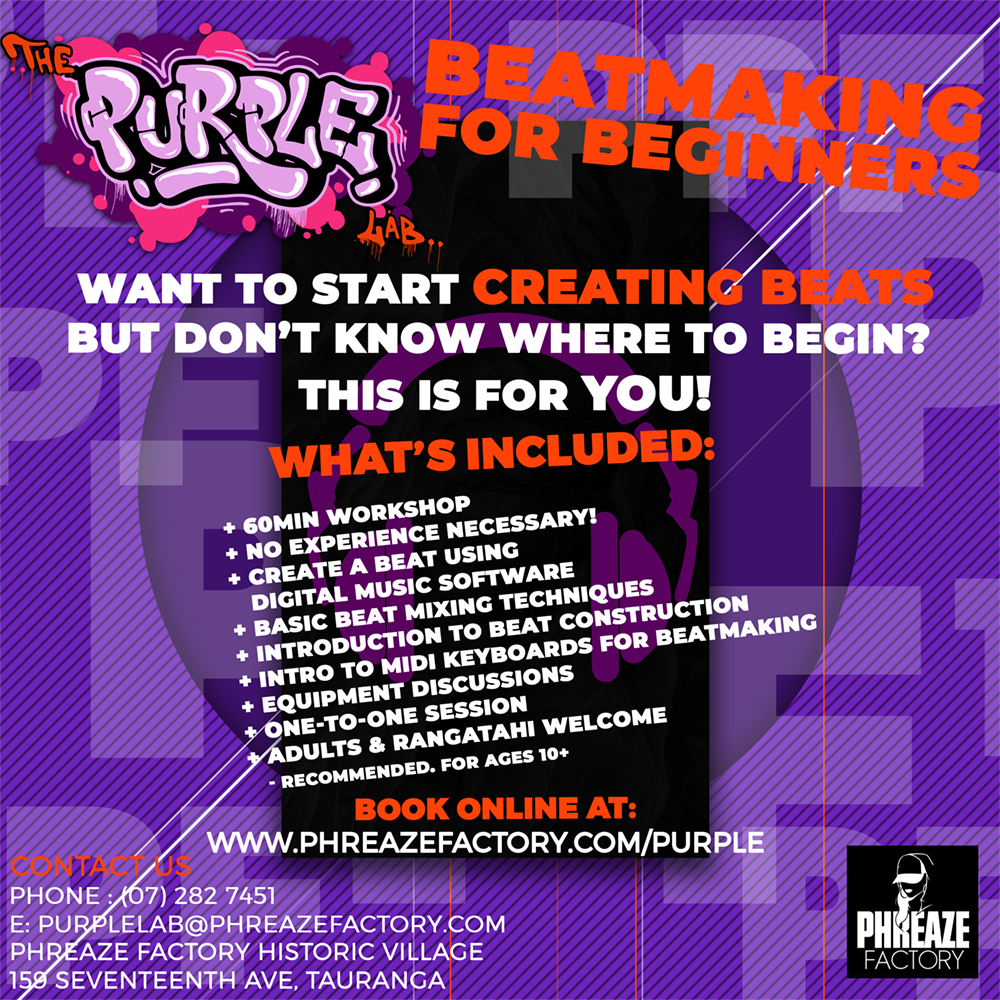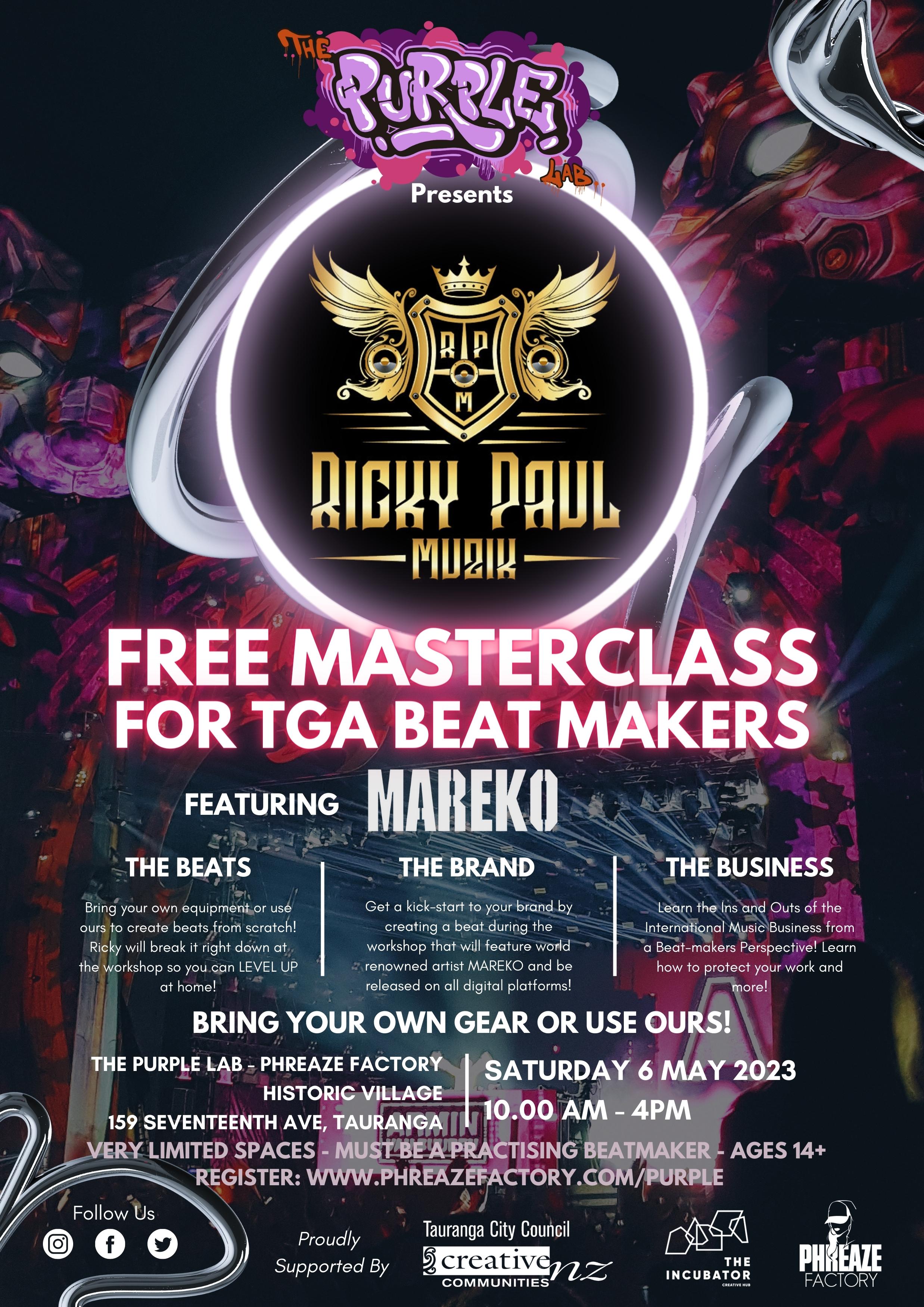 A FREE (thanks to Tauranga City Council Creative Communities Scheme!) one-day development workshop for practising or aspiring local beatmakers or producers facilitated by award-winning music producer, Ricky Paul Muzik. This workshop will not only work step-by-step through beatmaking production, it will also provide learning around the music industry from a beatmaker/producer perspective and will teach producers how to safeguard their work in the process.