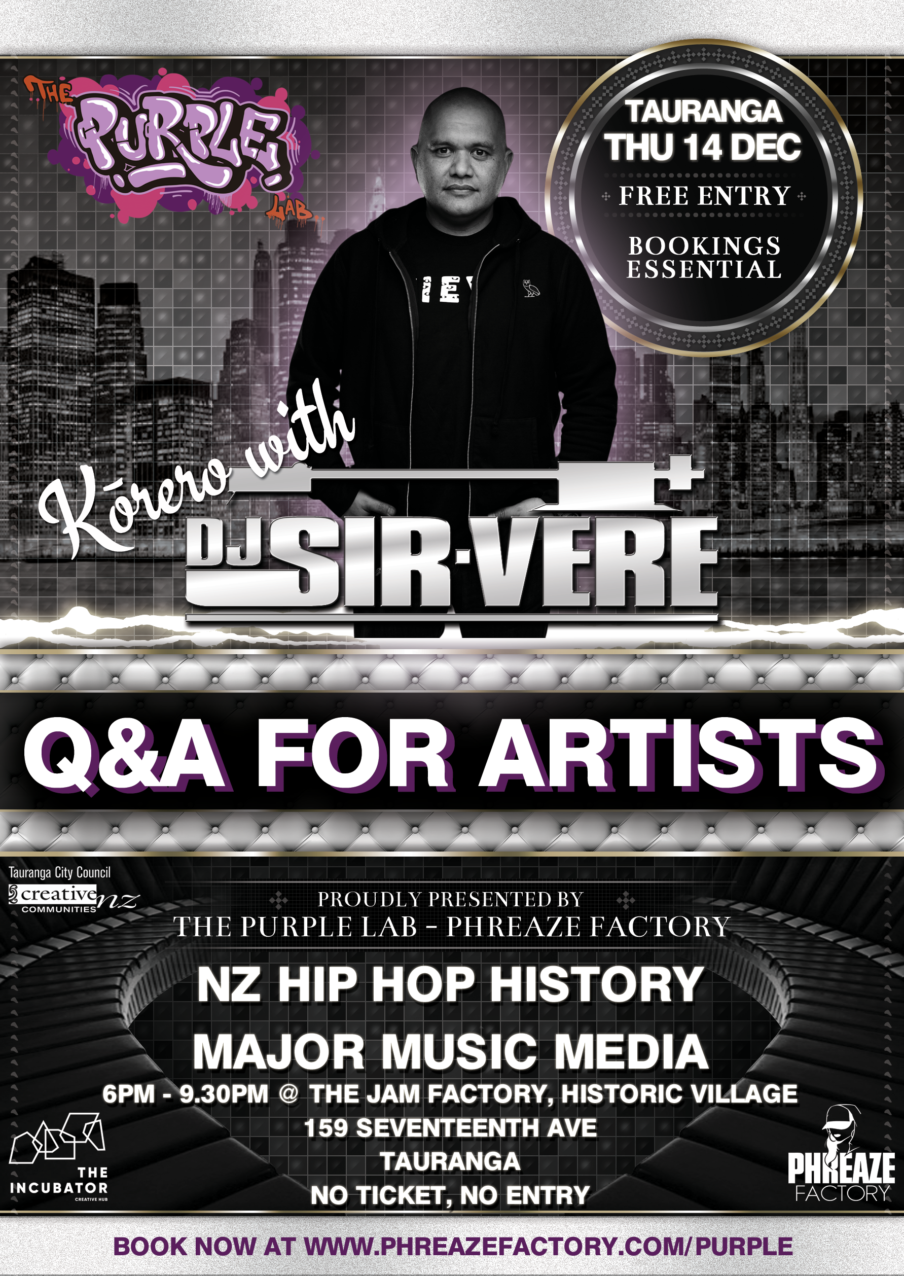 In this special edition workshop, we will tap into not only Sir-Vere's first-hand accounts of NZ Hiphop History, but also his extensive knowledge of Major Music Media (RADIO, TV, MAGAZINES, PODCASTS - he's done it all!), helping our local artists get their foot in the door!
