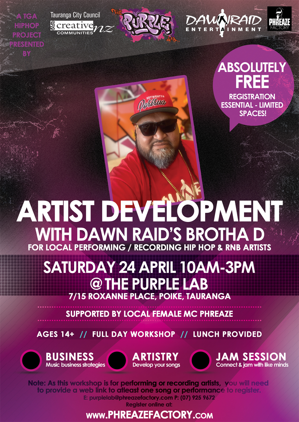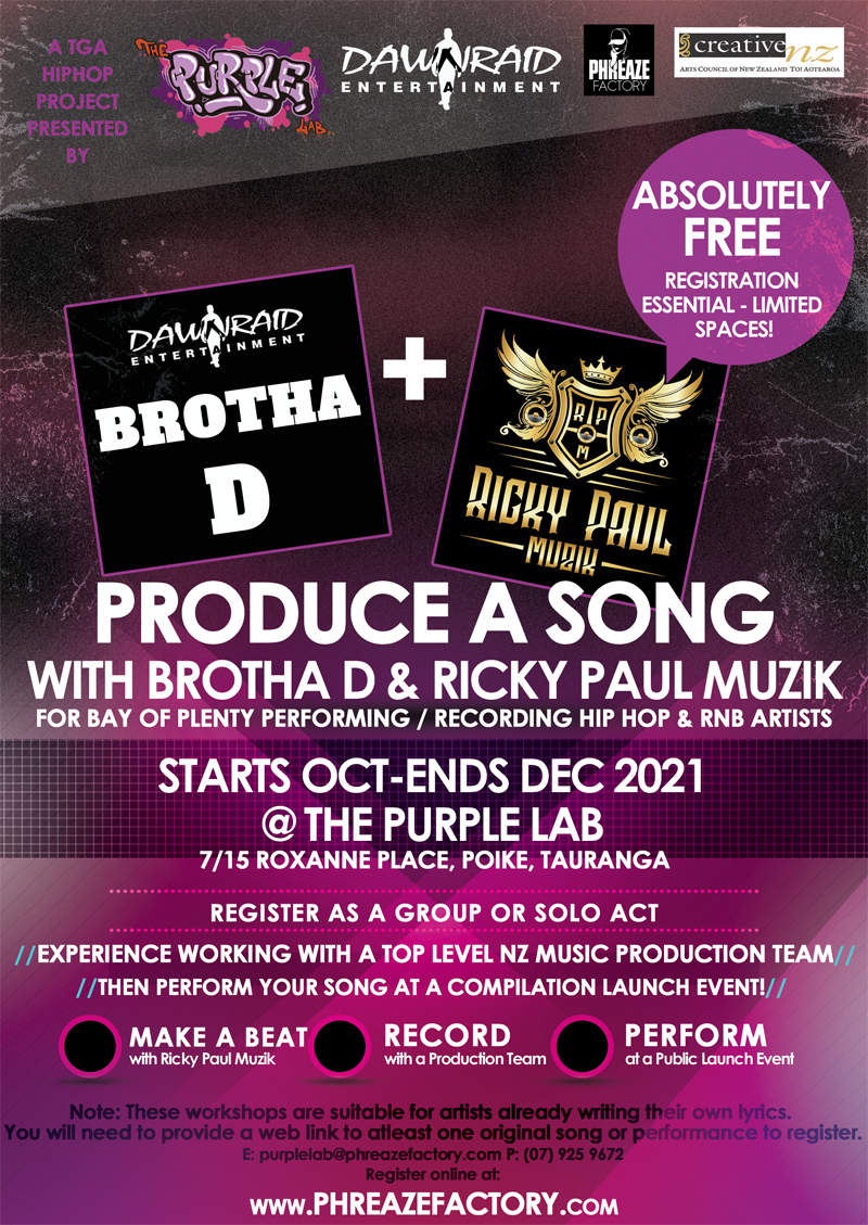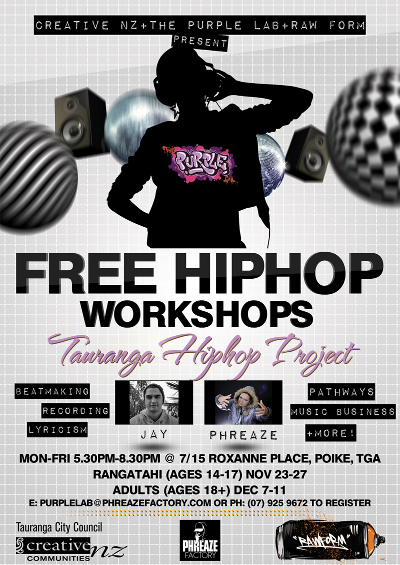 The Purple Lab is proud to announce that we have teamed up with CREATIVE NZ & RAW FORM to bring you a very special series of FREE beginner workshops as part of our TAURANGA COMMUNITY HIPHOP PROJECT!