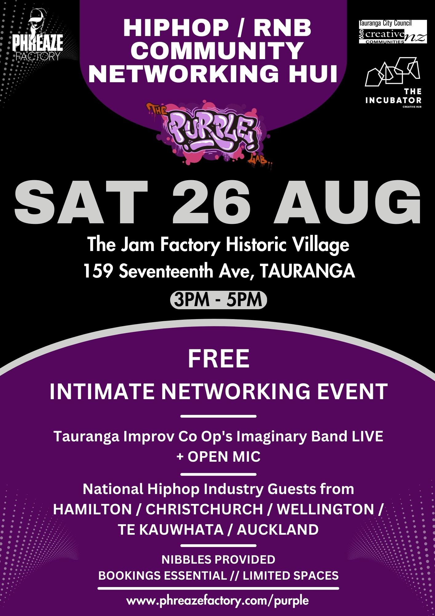A free and intimate Tauranga networking event for Hiphop & RnB Artists, Industry workers and the like including National guests, Live Band and Open Mic! Very limited spaces and booking is essential. Proudly Supported by Tauranga City Council's Creative Community Scheme.