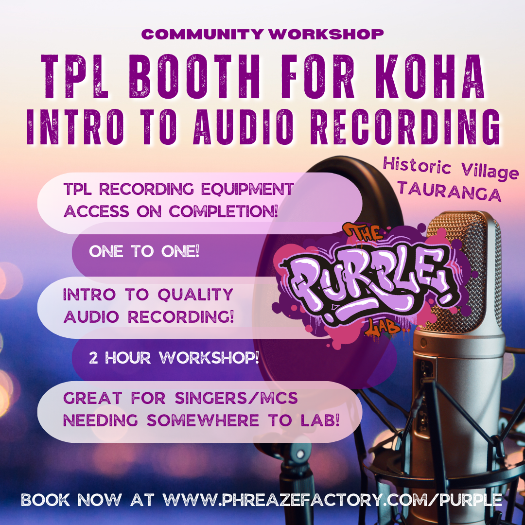 Already writing songs but have no idea how to record them? This introduction to audio recording workshop is a great place to start! What's even better - successfully complete this workshop to get your 'TPL Recording Booth Licence' then pay only a KOHA to use our booth and recording equipment in The Purple Lab afterwards!