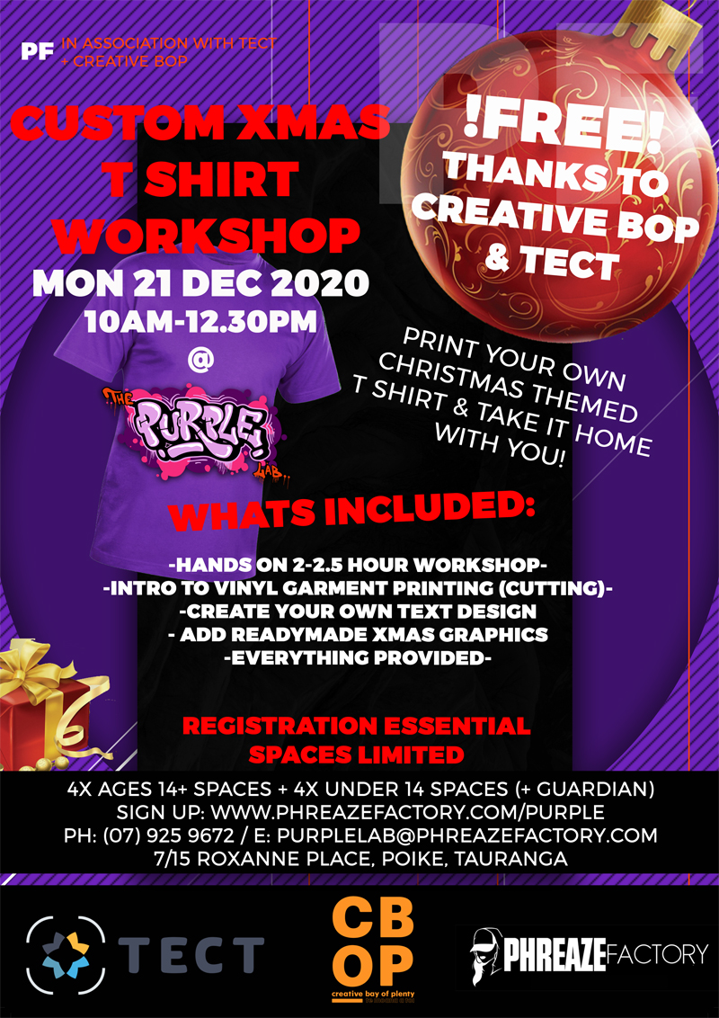 Thanks to Creative BOP & TECT, The Purple Lab is offering a one-off Custom Christmas T Shirt Workshop on Monday 21st December 2020 from 10am-12.30pm FREE OF CHARGE! Design your own custom text and add some of our pre-made Christmas graphics to spunk up your creation! We have just 4 spaces available for over 14's and 4 spaces (plus a guardian to help!) for under 14s. An awesome whanau Christmas activity!